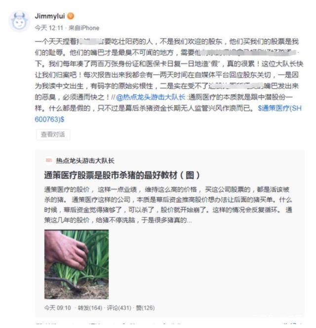 10月15日通策医疗三季报披露的前后两天内,其股价出现了明显的异常波动,日收盘价格跌幅偏离值累计达到20%以上。因投资者在雪球平台上质疑通策医疗为“股市最好杀猪教材”,顺手玩了一个谐音梗,把“通策医疗”戏谑为“通厕医疗”。公司实际控制人、董事长吕建明对此言论极其不满,丝毫不顾及企业形象,发文怒怼投资者“这样的人买我们的股票是我们的耻辱”。