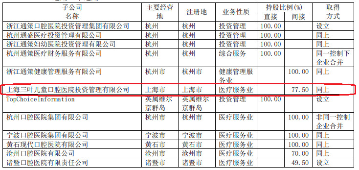通策医疗年报显示,上海三叶儿童口腔医院投资管理有限公司为上市公司间接持股77.50%的子公司。