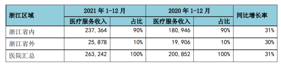 2021年报显示,通策医疗口腔医疗服务营业面积超过20万平方米,开设牙椅2246台,口腔医疗门诊量达到279.82万人次。浙江省内依然贡献了大部分医疗服务收入,2021年省内医疗服务收入23.74亿元,占比90%。