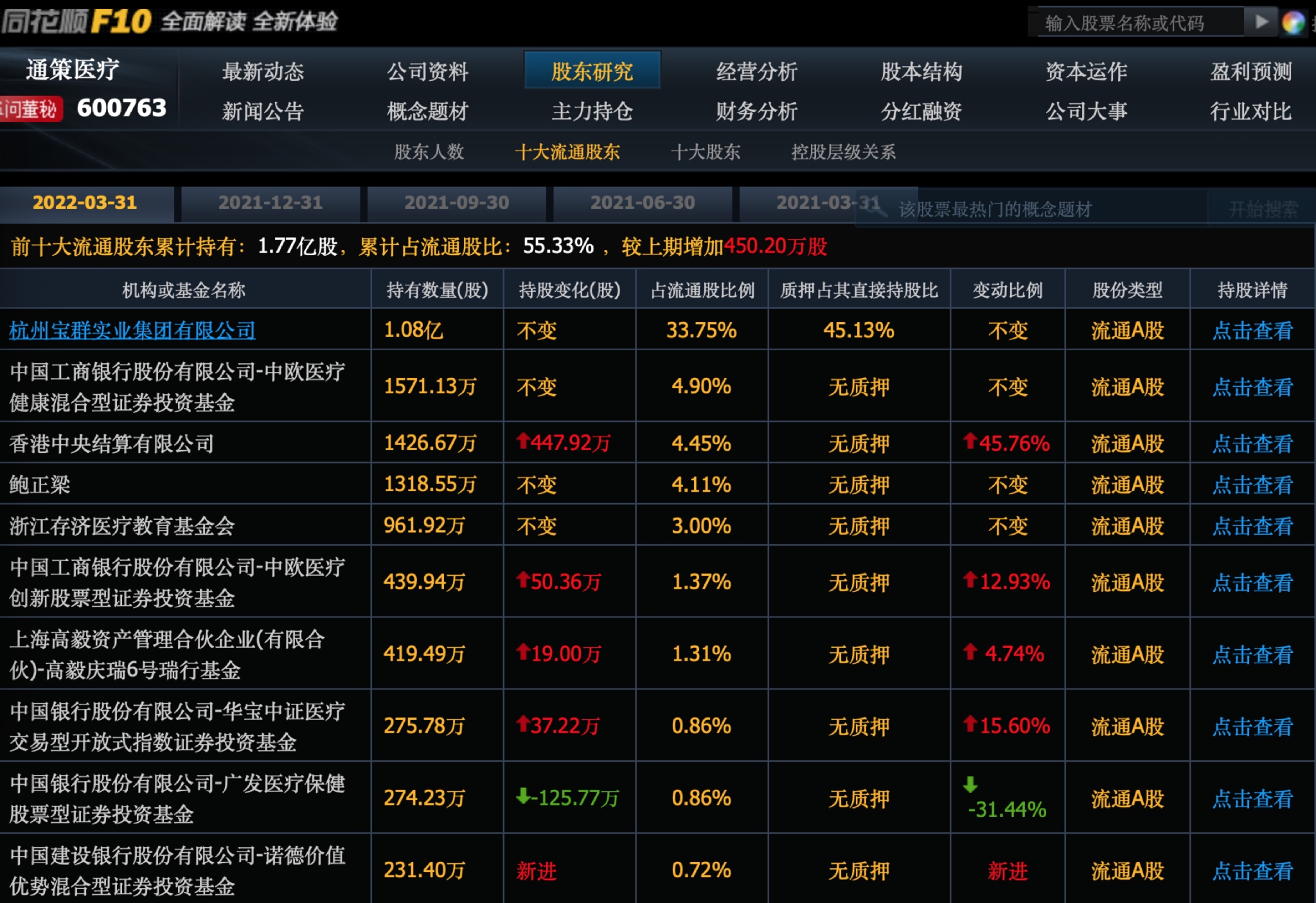 2022年一季度末,葛兰管理的中欧医疗健康混合型证券投资基金(下称“中欧医疗”)持有通策医疗1517.13万股,持股比例4.9%,去年三、四两个季度,分别加仓了441.17万股和143.74万股。同样由葛兰管理的中欧医疗创新股票型证券投资基金,则在2021年末进入前十大流通股东,且在今年一季度加仓50.36万股。