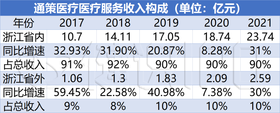 2021年,通策医疗浙江省内外的收入分别为23.74亿元和2.59亿元,浙江省内收入占比超90%,这五年来几乎一直如此。最大的一家医院就是杭州口腔医院。