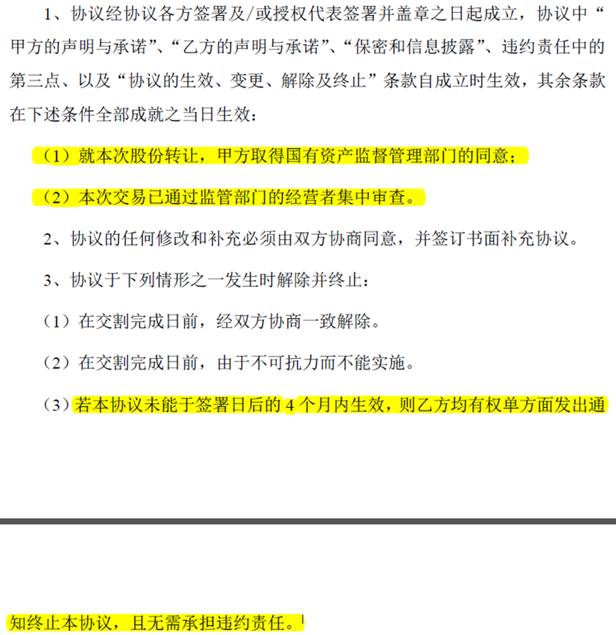 同时,双方约定,若本协议未能于签署日后的4个月内生效,则乙方均有权单方面发出通知终止本协议,且无需承担违约责任。