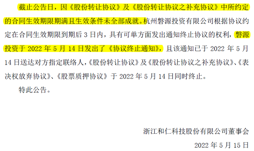 5月15日,和仁科技发公告,因《股份转让协议》及《股份转让协议之补充协议》中所约定的合同生效期限期满且生效条件未全部达成,磐源投资于2022年5月14日发出了《协议终止通知》。