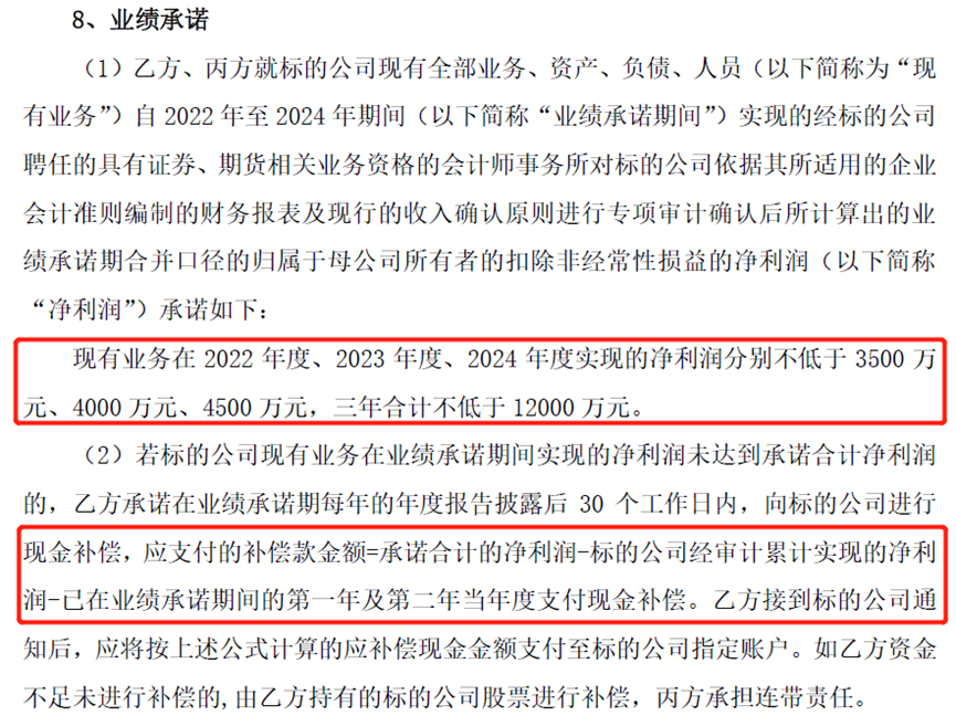 据转让方磐源投资做出的业绩承诺,和仁科技现有业务在2022年、2023年、2024年实现的净利润分别不低于3500万元、4000万元、4500万元,三年合计不低于1.2亿元。