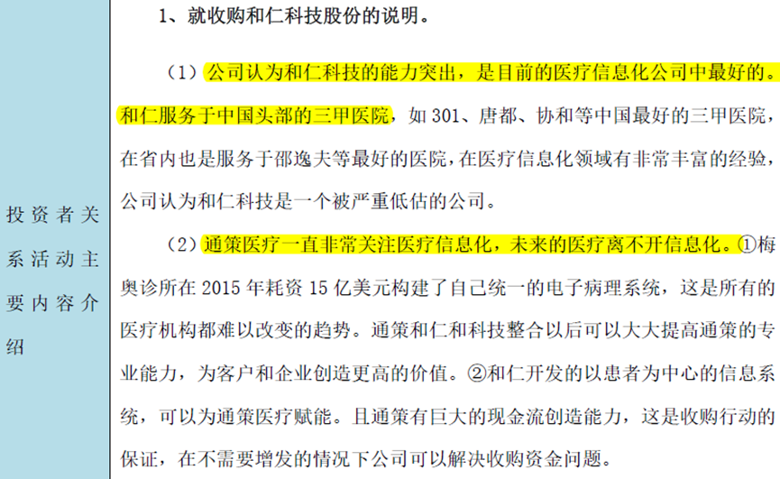 通策医疗表示,收购是基于公司关注医疗信息化,而和仁科技是目前的医疗信息化公司中最好。