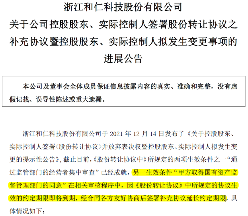又过了一个月,在协议期限届满前一日,和仁科技再发公告,称另一生效条件“甲方取得国有资产监督管理部门的同意”在相关审核程序中,因《股份转让协议》中所规定的协议生效的约定期限即将到期,经合同各方友好协商后签署补充协议延长约定期限。