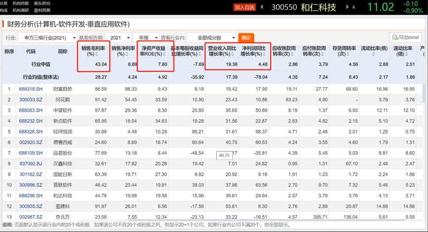 在和仁科技所在的申万三级行业中,营收增长率中位数为19.38%,净利润增长率中位数为4.48%,毛利率中位数为43.04%,ROE中位数为7.80%。