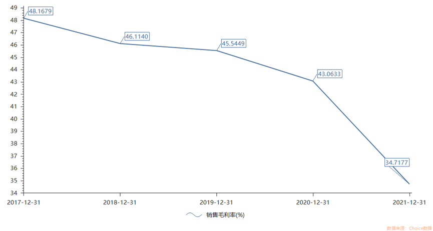 毛利率最近五年也是逐年下跌,2021年更是跌落至40%以下,仅有34.7%。