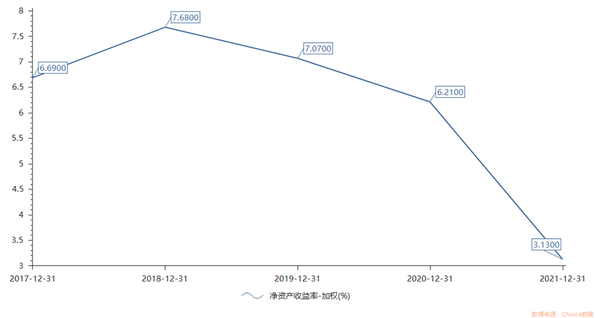 另一方面,ROE最近五年都只有可怜的个位数,2021年创下近5年新低,只有3.13%。
