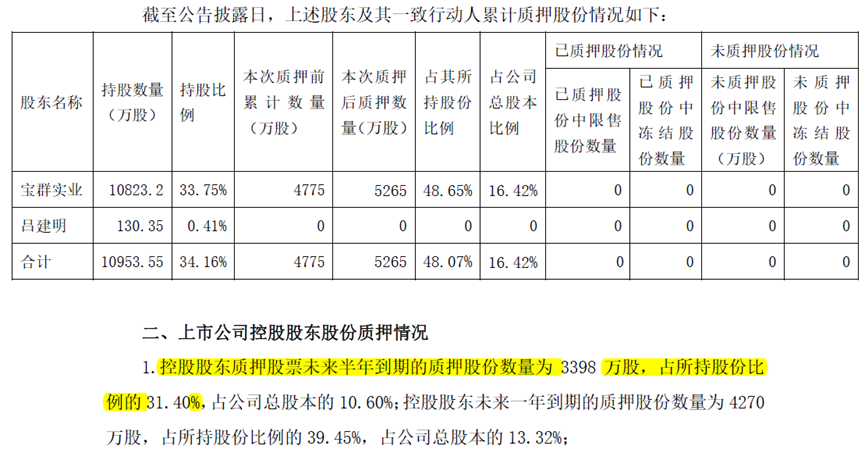 本次质押后,控股股东共质押5265万股,占其所持股份的48.65%,其中3398万股未来半年到期,占其所持股份的31.4%。