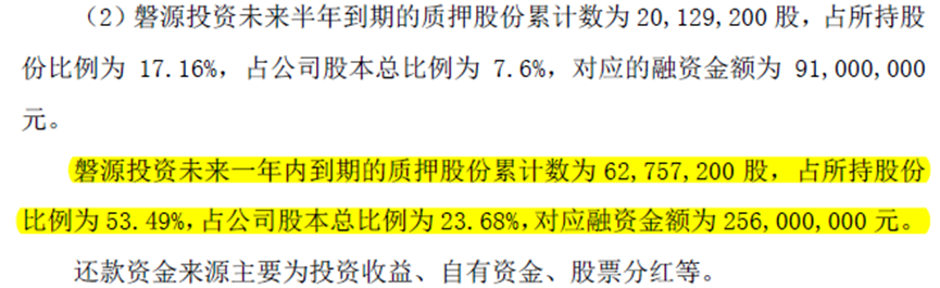 据和仁科技2021年6月24日发布公告,大股东磐源投资未来一年内到期的质押股份累计数为6275万股,占所持股份比例为53.49%,占公司股本总比例为23.68%,对应融资金额为2.56亿元。