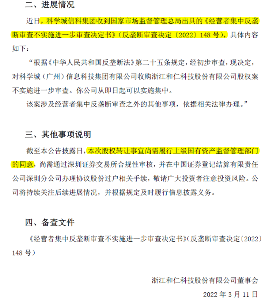 2022年3月11日,和仁科技发公告,科学城信科集团收到国家市场监督管理总局出具的《经营者集中反垄断审查不实施进一步审查决定书》,生效条件之一“通过监管部门的经营者集中审查”已达成。