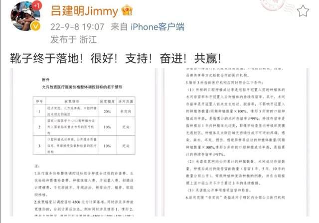 在昨晚19点07分,通策医疗董事长公开发声称,“靴子终于落地!很好!支持!奋进!共赢!”今日,通策医疗方面回应种植牙医疗服务价格调控称,“好于此前市场预期,对公司是利好”。