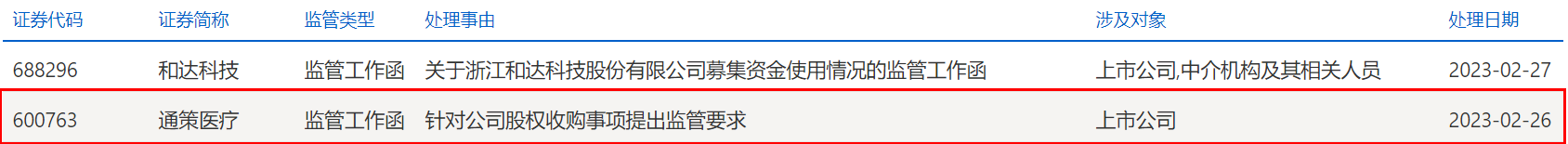 昨日,上交所网站披露对通策医疗(600763.SH)的监管工作函,处理事由为针对公司股权收购事项提出监管要求,涉及对象为上市公司。