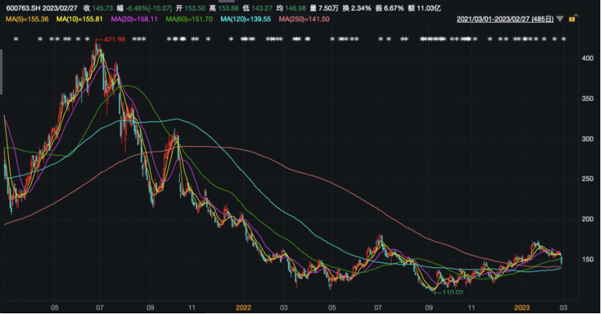 截至2月27日收盘,通策医疗每股报收于145.73元,较此前高点跌超六成