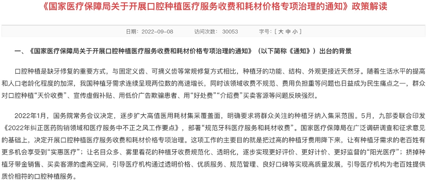 据悉,2022年1月,国务院常务会议决定,逐步扩大高值医用耗材集采覆盖面,明确要求将群众关注的种植牙纳入集采范围;5月,九部委联合印发工作要点,部署“规范牙科医疗服务和耗材收费”。同年9月,国家医保局又发布对上述政策的解读公告。