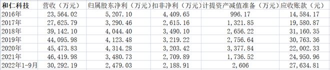 和仁科技至今还没有发布业绩预告或者年报,2022年三季报披露1-9月营收3.03亿,同比降0.98%;净利润2479万,同比降29.29%;扣非净利2189万,同比降25.07%。公司方面称,这是受到疫情影响所致。