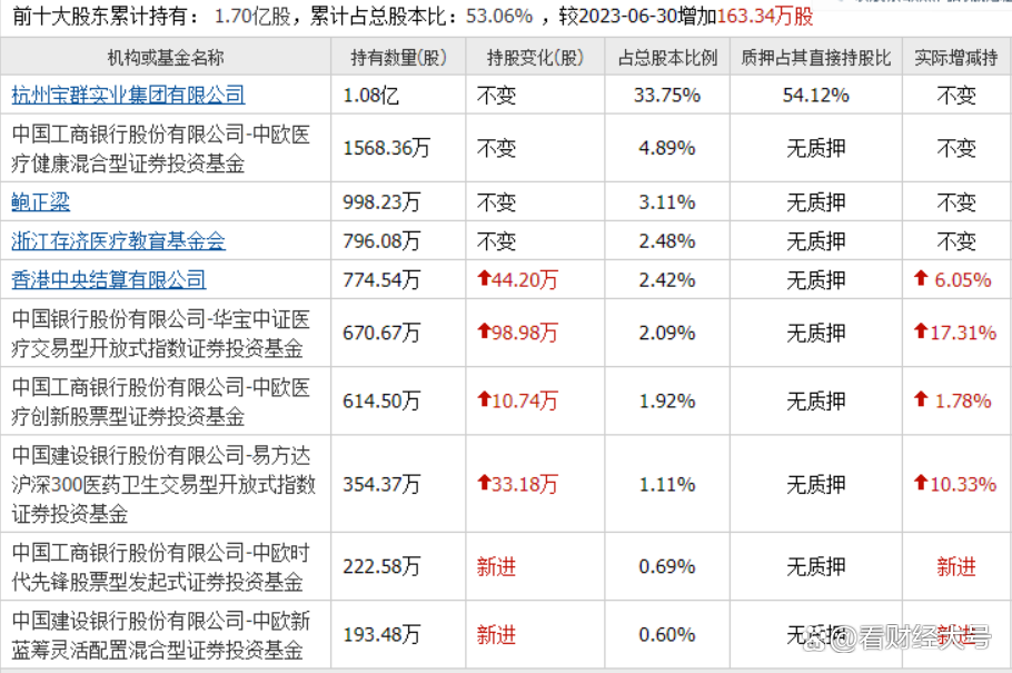 根据财报显示,在前十大股东中,有2名股东新进成为通策医疗前十大股东,另有4名股东不同程度加仓,其余股东持股数保持不变。