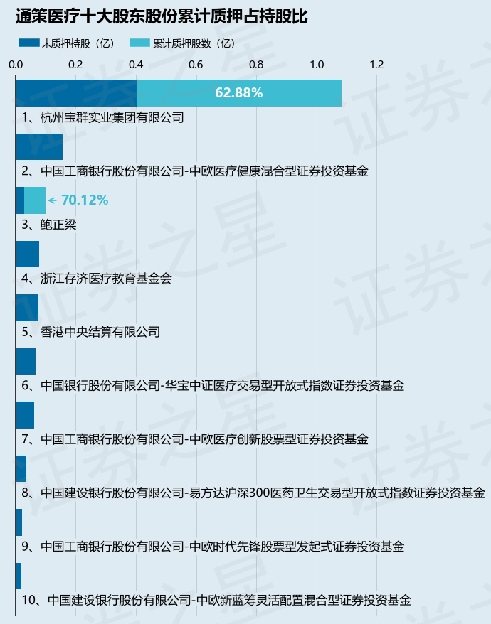 截止本公告日,股东杭州宝群实业集团有限公司已累计质押股份6805.5万股,占其持股总数的62.88%,股东鲍正梁已累计质押股份700.0万股,占其持股总数的70.12%。本次质押后通策医疗十大股东的累计质押股份占持股比例见下图: