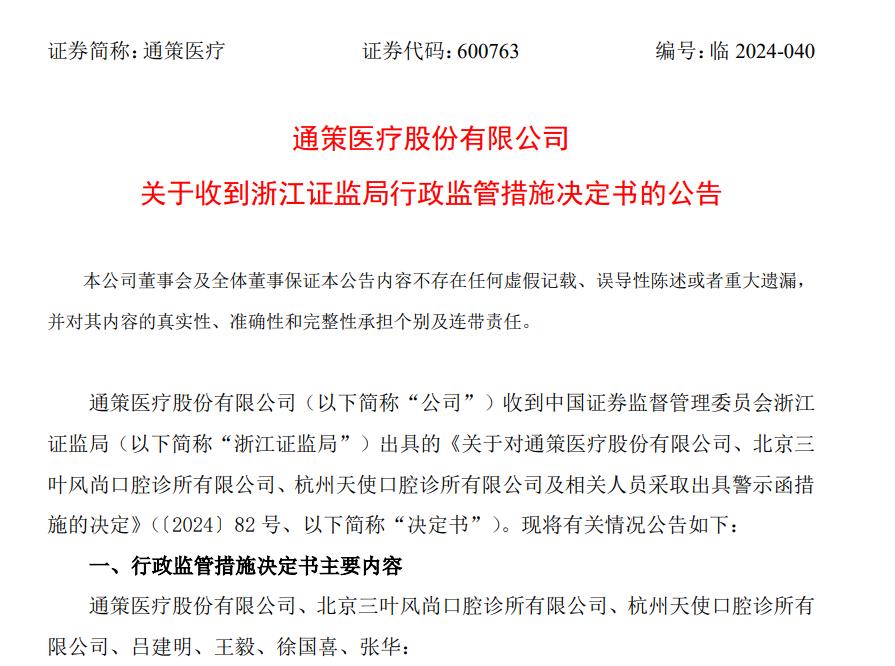 5月23日,通策医疗发布公告称,收到浙江证监局行政监管措施决定书。