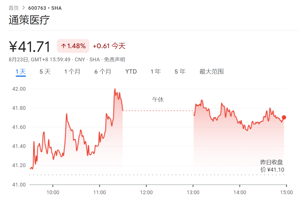 截止今日收盘,通策医疗报41.71元/股,上涨1.48%。