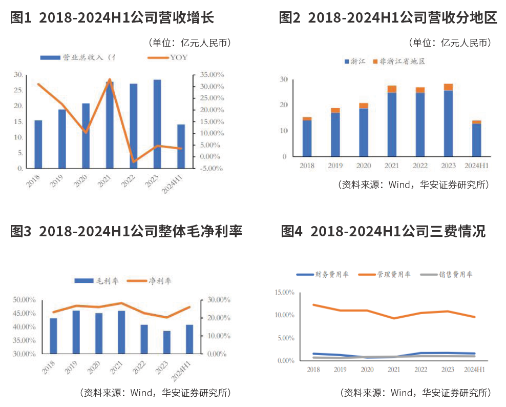 通策医疗主要依靠杭州口腔医院历史悠久的口碑、品牌,所以在浙江省内知名度高,揽客容易,销售费用低,但出省后就难度大增。公司目前主要营收也在浙江省内。截至2024年上半年,杭州口腔医院、宁波口腔医院在浙江省内开业机构已有63家,另有10余家正在筹建中,每年全省患者门诊量近300万人次。上市公司旗下共有84家医疗机构,2024年上半年口腔医疗门诊量达171万人次。从这些数据可以看出,公司的医疗分支机构有8成左右在浙江省内,门诊量与营业收入的9成左右也在省内。