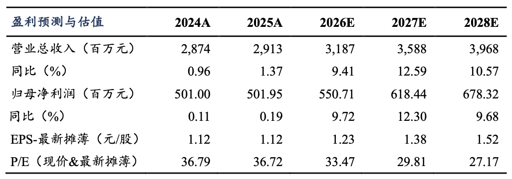 事件:2025年,公司实现营业总收入29.13亿元(+1.37%,表示同比增速,下同),归母净利润5.02亿元(+0.19%),扣非归母净利润4.96亿元(-0.12%);2025Q4季度,公司实现营业总收入6.23亿元(-2.77%),归母净利润-0.12亿元(2024Q4为0.03亿元),扣非归母净利润-0.13亿元(2024Q4为0.02亿元)。2026Q1季度,公司实现营业总收入7.55亿元(+1.43%),归母净利润1.87亿元(+1.66%),扣非归母净利润1.85亿元(+1.37%)。业绩保持稳健增长。