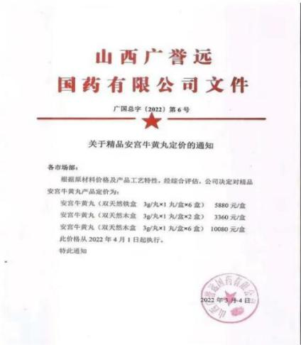 近日,一份名为“关于精品安宫牛黄丸定价的通知”的文件在各大论坛广为流传,文件下方的印章为山西广誉远国药有限公司。该文件指出,根据原材料价格及产品工艺特性,公司决定对精品安宫牛黄丸产品定价。