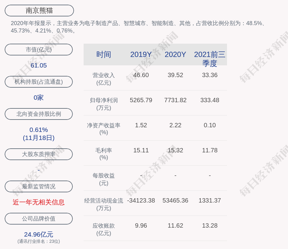 2020年年报显示,南京熊猫的主营业务为电子制造产品、智慧城市、智能制造、其他,占营收比例分别为:48.5%、45.73%、4.21%、0.76%。