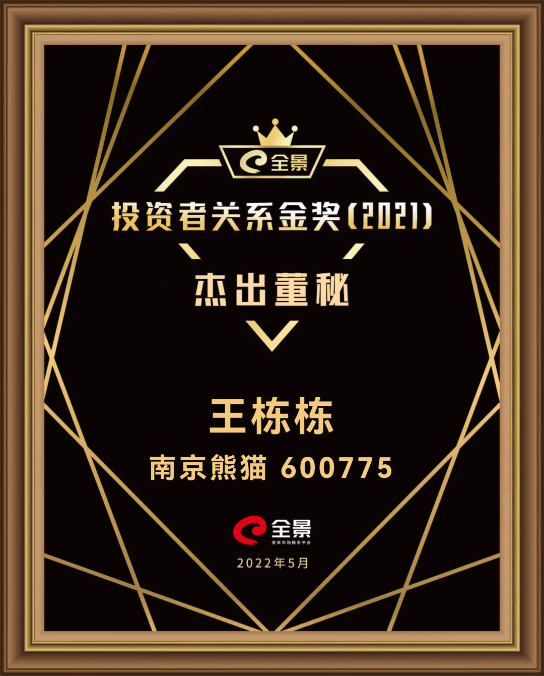 日前,“全景投资者关系金奖”2021年度全国性评选获奖榜单正式揭晓,南京熊猫(600775)凭借优异的投资者关系管理和良好的品牌形象脱颖而出,公司董事会秘书王栋栋斩获“全景投资者关系金奖杰出董秘”殊荣。