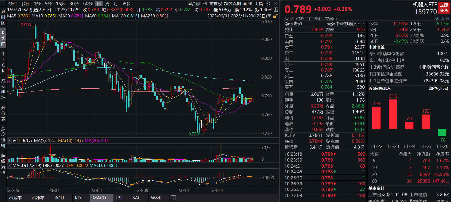 截至2023年11月29日10:28,机器人ETF(159770)震荡上行,买盘活跃。