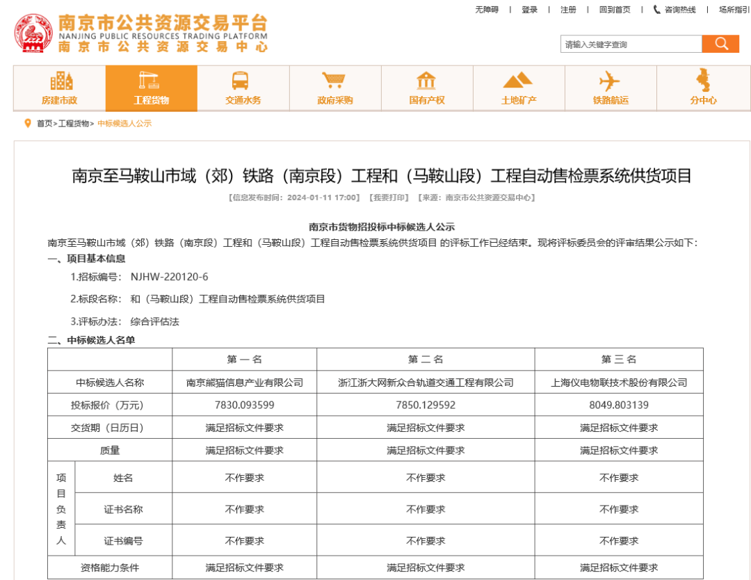 南京熊猫电子股份有限公司所属熊猫信息继2023年在全国城轨自动售检票系统项目中标金额取得榜首的佳绩后,近日迎来新年“开门红”——成功中标南京至马鞍山市域(郊)铁路工程自动售检票系统供货项目,中标金额7830万元。