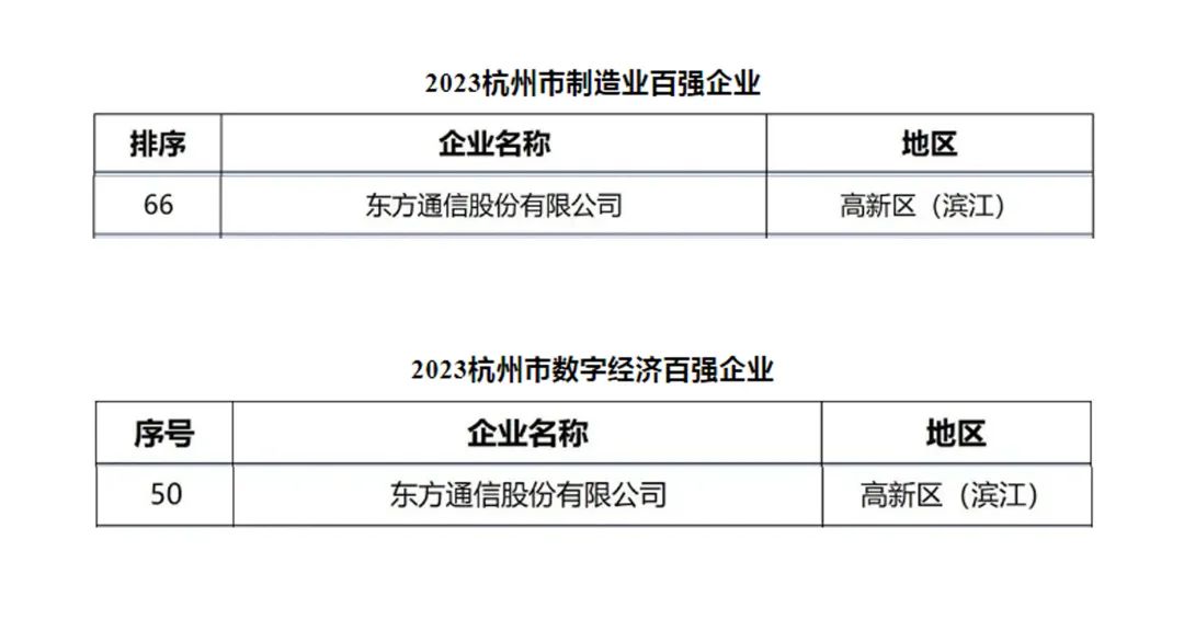 10月30日,浙江省工业和信息化研究院、杭州市工业经济联合会、杭州市企业联合会、杭州市企业家协会正式发布2023杭州市百强企业榜单,东方通信股份有限公司(简称:东方通信)凭借多年的创新发展和实践沉淀,荣登2023杭州市制造业百强企业榜单和2023杭州市数字经济百强企业榜单。