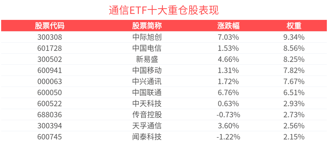 数据显示,截至2025年8月29日,国证通信指数前十大权重股分别为新易盛、中际旭创、中兴通讯、中国电信、中国移动、中国联通、天孚通信、中天科技、传音控股、闻泰科技,前十大权重股合计占比64.43%。
