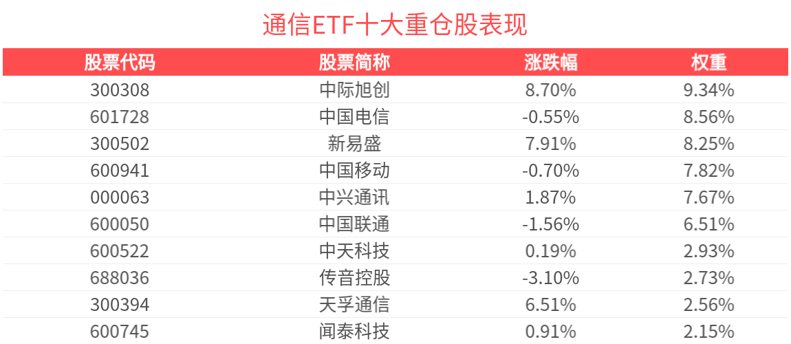 数据显示,截至2025年8月29日,国证通信指数前十大权重股分别为新易盛、中际旭创、中兴通讯、中国电信、中国移动、中国联通、天孚通信、中天科技、传音控股、闻泰科技,前十大权重股合计占比64.43%。