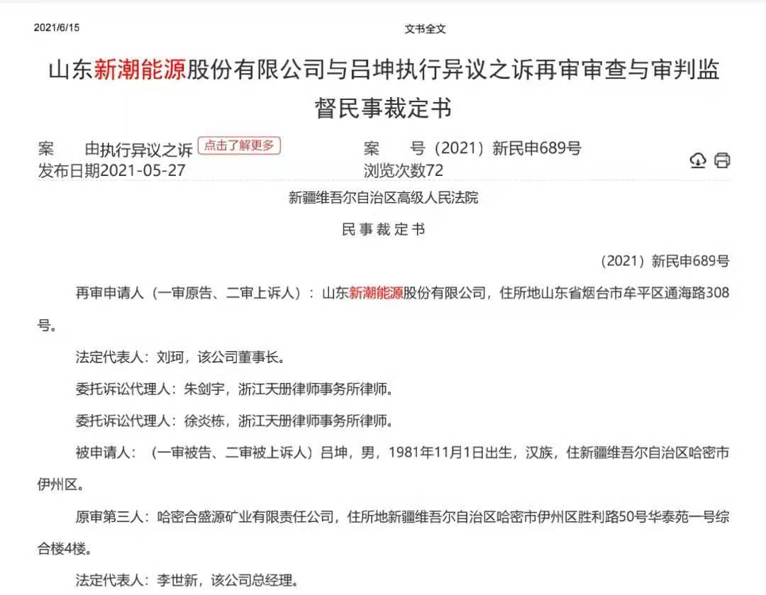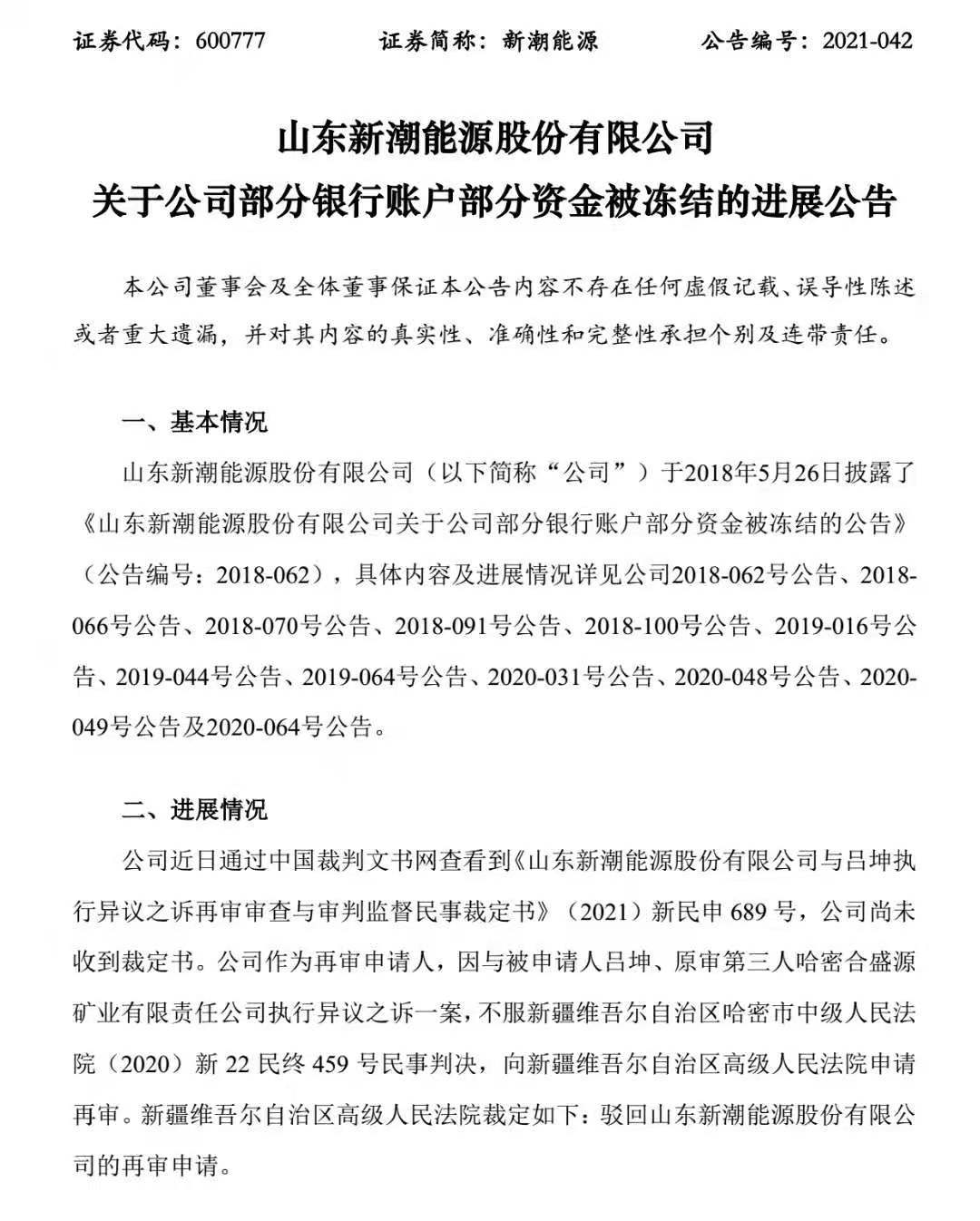 2021年6月19日,新潮能源发布《关于公司部分银行账户资金被冻结的进展公告》,公告中称,公司不服新疆哈密市中级人民法院的判决,向新疆高级人民法院申请再审,新疆高级人民法院驳回了公司的再审申请。