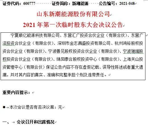 据该人士提供的股东大会决议显示,今年7月8日新潮能源在上海凯宾斯基酒店召开了2021年第一次临时股东大会。