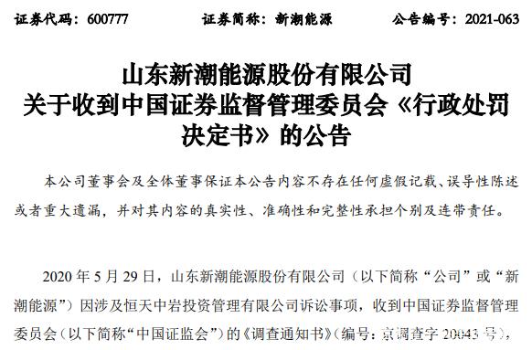 山东新潮能源股份有限公司(新潮能源,600777)在2021年12月25日发布了关于收到中国证券监督管理委员会《行政处罚决定书》的公告。公告内容显示,证监会依据新潮能源违法行为的事实、性质、情节与社会危害程度,对其责令改正给予警告并罚款30万元,对董事长黄万珍和总经理胡广军予警告并分别罚款30万元,其他相关责任人员警告并处不同金额罚款。
