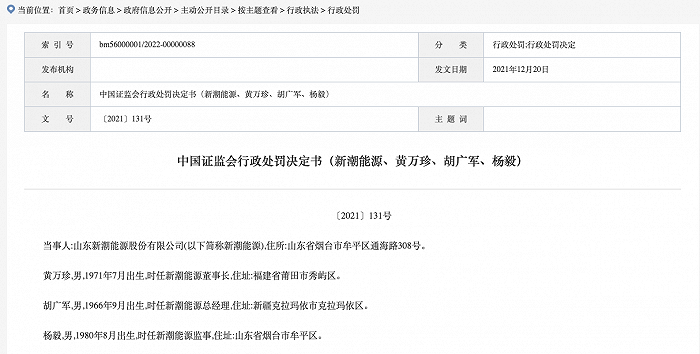 1月4日,证监会网站公布的一份行政处罚决定书显示,经查明,新潮能源未及时、未在定期报告中披露重大担保事项,证监会决定:对新潮能源给予警告,并处以30万元罚款;对时任董事长黄万珍给予警告,并处以30万元罚款;对时任总经理胡广军给予警告,并处以30万元罚款;对时任监事杨毅给予警告,并处以10万元罚款。