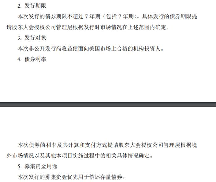 此项议案的主要内容为全权委托管理层办理非公开发行总额不超过7.5亿美元期限不超过7年期的高收益债,债券利率由管理层根据境外市场情况确定,议案中称募集资金将优先用于偿还存量债券。