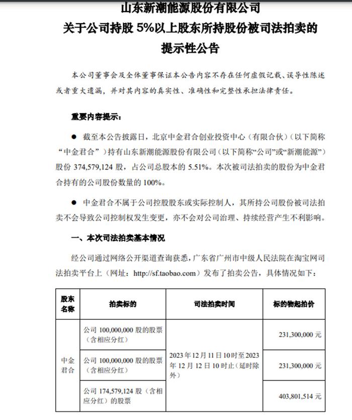 11月11日,新潮能源发布公告,关于公司持股5%以上股东北京中金君合创业投资中心(有限合伙)(以下简称“中金君合”)所持股份被司法拍卖的提示性公告。将持有山东新潮能源股份有限公司股份374,579,124 股,占公司总股本的5.51%进行拍卖。