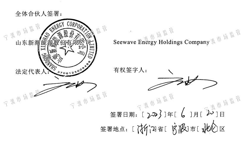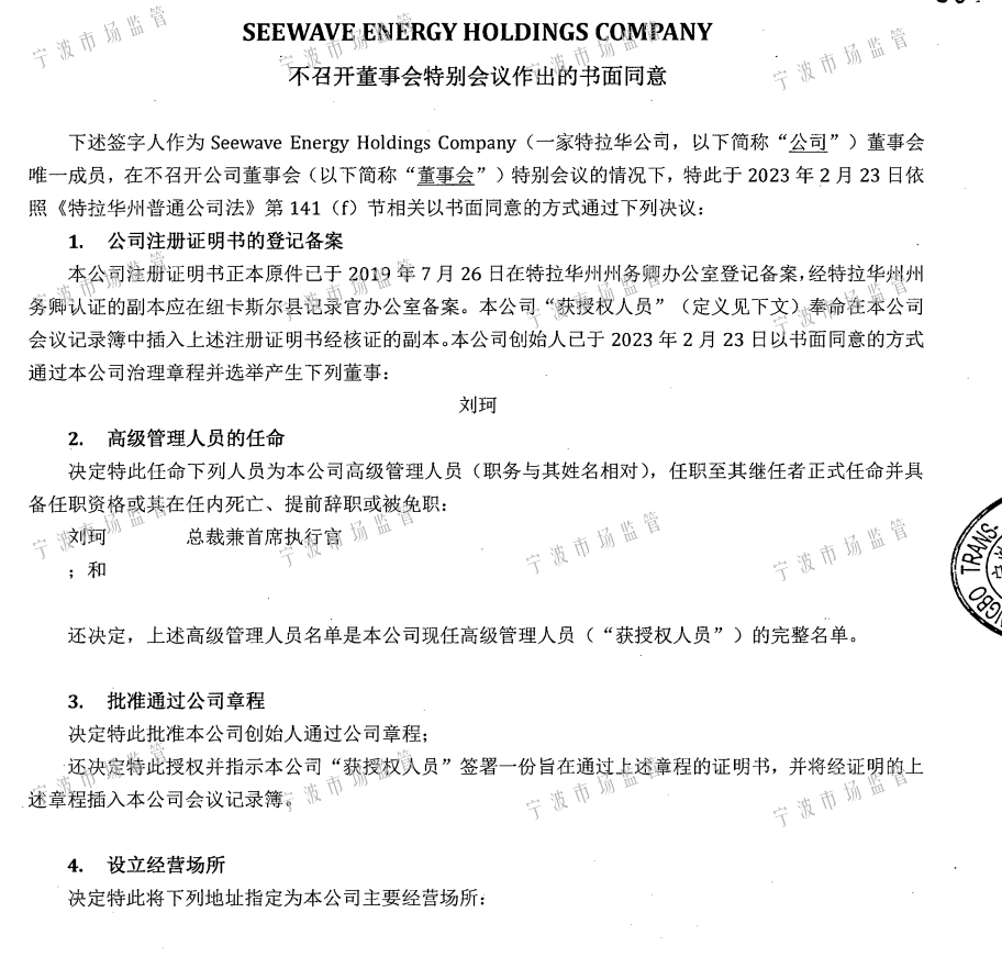 2023年6月20日,合伙份额转让再次上演。Surge Energy Capital将宁波鼎亮的0.01%财产份额转让给另外一家美国私人公司Seewave Energy Holdings Company(下称“Seewave”)。Seewave在获得财产份额的同时,亦继承了2023年5月18日修订后的合伙协议,权限从Surge Energy Capital转移至Seewave身上。值得注意的是,Seewave的董事、总裁兼CEO均为刘珂。
