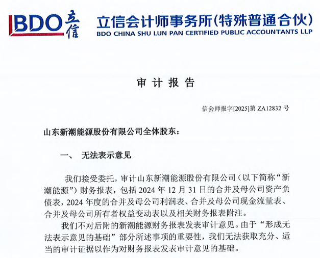值得关注的是,因未能按时披露定期报告,*ST新潮股票自5月6日起停牌,并引发证监会立案调查。在经历数月的加急审计后,立信会计师事务所7月5日完成了ST新潮2024年年报及2025年一季报的审计。然而,立信对财务报告和内部控制均出具了“无法表示意见”的审计结论。