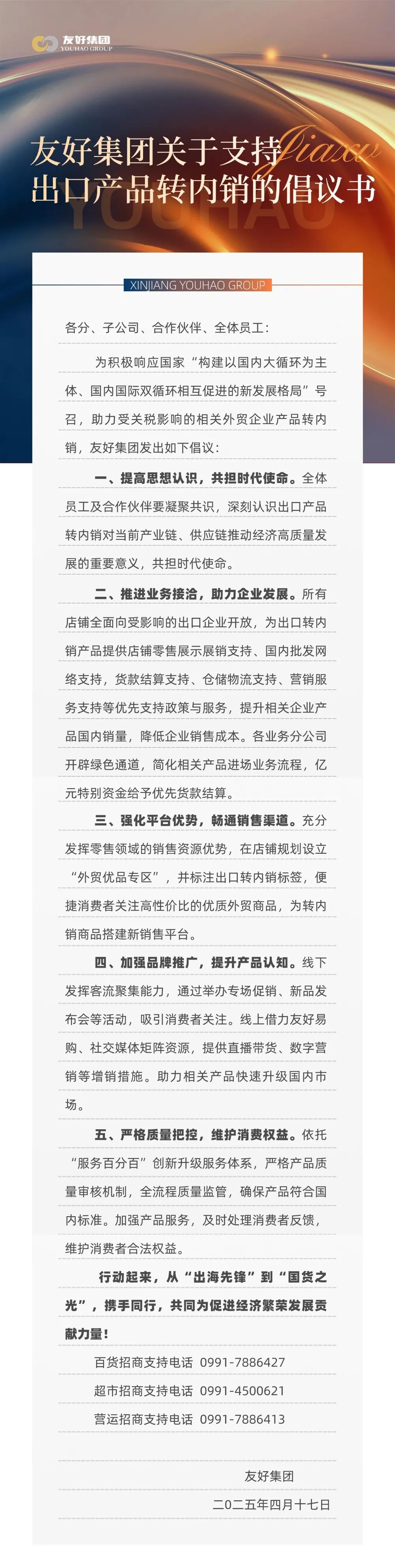 友好集团关于支持出口产品转内销的倡议书