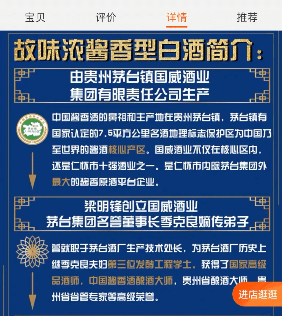 据传,国威酒业实控人梁明锋一直对外号称自己是贵州茅台第一任董事长季克良的“嫡传弟子”,来提高国威酒业的身价。至今在淘宝贵州国威酒业销售公司官方店中,部分产品的介绍中仍然明显标注着上述宣传语。不过,此前2016年国威酒业还曾因注册“季工坊”商标与茅台集团发生争执,双方卷入法律诉讼,最终法院判决国威酒业不正当利用季克良个人声誉的商业价值,对季克良姓名权造成伤害。但显然,国威酒业并未因此停止对季克良的“消费”。