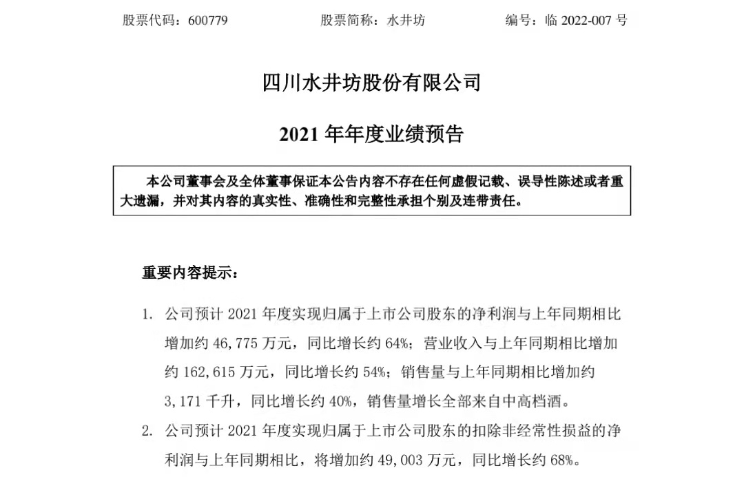 另外,水井坊预计营业收入与上年同期相比增加约16.26亿元,同比增长约54%,去年同期约为30.06亿元;销售量与上年同期相比增加约3171千升,同比增长约40%,去年销售量为7861千升。其中,销售量增长全部来自中高档酒。