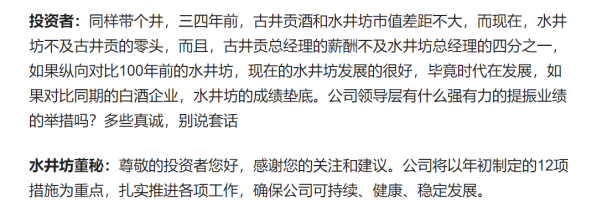 “同样带个井,三四年前市值差距不大,而现在,水井坊不及古井贡的零头。而且,古井贡总经理的薪酬不及水井坊总经理的四分之一,如果纵向对比100年前的水井坊,现在的水井坊发展的很好,毕竟时代在发展,如果对比同期的白酒企业,水井坊的成绩垫底。公司领导层有什么强有力的提振业绩的举措吗?多些真诚,别说套话”