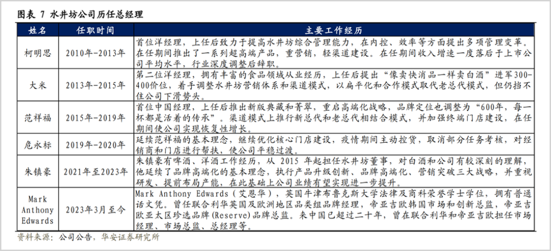 拉长时间来看,水井坊在总经理的任用上也如同流水,自2013年来10年间先后历经了6位总经理。包括3位洋高管柯思明、大米及刚刚上任的艾恩华,中国职业经理人范祥福、危永标和前帝亚吉欧内部高管朱镇豪。
