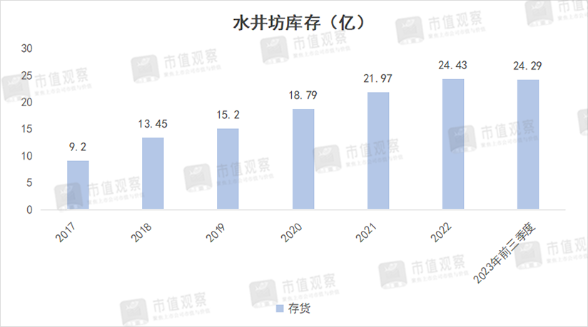 自2017年来,水井坊库存一路水涨船高,由9.2亿一路增长至2023年前三季度24.29亿,已经超过同期35.88亿营业收入65%,仍然没有减缓迹象。