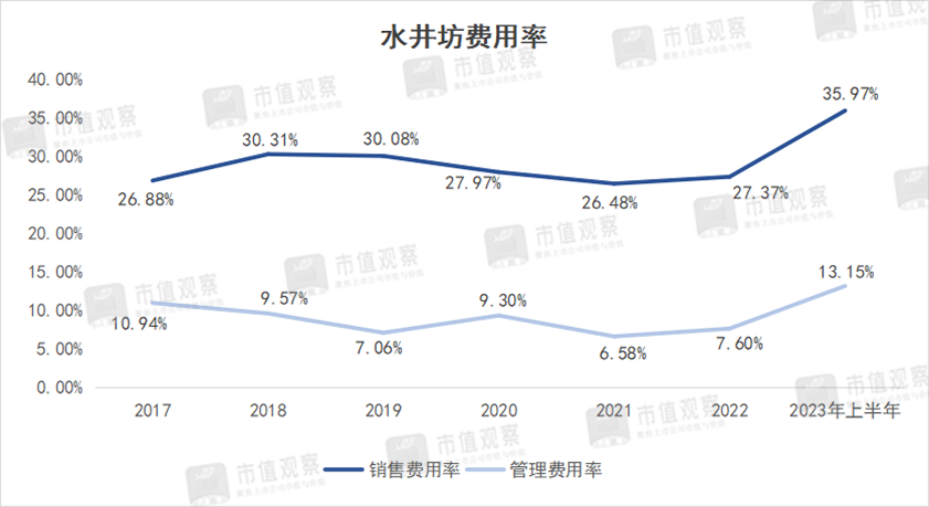 2023年上半年水井坊管理费用率为13.15%,明显高于贵州茅台的5.4%、泸州老窖的3.7%等。